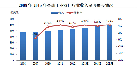 從中長(zhǎng)期來看,影響閥門行業(yè)的下游行業(yè)擴(kuò)張的主要因素,包括不斷增長(zhǎng)的能源需求、全球人口的持續(xù)增加以及發(fā)展中國家的城市化、工業(yè)化進(jìn)程并沒有因金融危機(jī)而發(fā)生根本性改變。目前全球各主要經(jīng)濟(jì)體都已經(jīng)進(jìn)入經(jīng)濟(jì)復(fù)蘇周期(根據(jù)國際貨幣基金組織的統(tǒng)計(jì)和預(yù)測(cè)數(shù)據(jù),2010年、2011年和2012年全球經(jīng)濟(jì)增長(zhǎng)實(shí)現(xiàn)恢復(fù)性增長(zhǎng),增長(zhǎng)率分別為5.3%、3.9%和3.2%,2013年和2014年全球經(jīng)濟(jì)年增長(zhǎng)速度預(yù)計(jì)為2.9%和3.6%)。閥門行業(yè)自2010年也開始走向復(fù)蘇,根據(jù)McIlvaine的調(diào)查和預(yù)測(cè)數(shù)據(jù),2010年、2011年和2012年,全球工業(yè)閥門行業(yè)收入分別為492.24億美元、513.17億美元和532.61億美元,增長(zhǎng)率恢復(fù)至3.77%、4.25%和3.79%,2013年-2015年全球工業(yè)閥門行業(yè)的預(yù)計(jì)銷售增長(zhǎng)率將分別達(dá)到4.22%、4.05%和4.36%,呈現(xiàn)穩(wěn)步上升的增長(zhǎng)態(tài)勢(shì)。