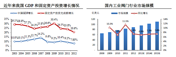 2003年-2012年,中國經(jīng)濟(jì)總體上保持快速增長(zhǎng)的發(fā)展態(tài)勢(shì),平均GDP增長(zhǎng)率為10.45%,全社會(huì)固定資產(chǎn)投資完成額增長(zhǎng)率平均為26.11%。國內(nèi)閥門行業(yè)整體上保持持續(xù)增長(zhǎng)的態(tài)勢(shì),景氣程度高于全球水平。2008年全球金融危機(jī)爆發(fā)后,國內(nèi)閥門行業(yè)增速下滑,但在2010年又恢復(fù)到較高的增長(zhǎng)水平。根據(jù)McIlvaine的分析,預(yù)計(jì)2013年至2015年,中國工業(yè)閥門行業(yè)市場(chǎng)規(guī)模的增長(zhǎng)率還將穩(wěn)定在7%左右,遠(yuǎn)高于全球的工業(yè)閥門行業(yè)增長(zhǎng)速度。